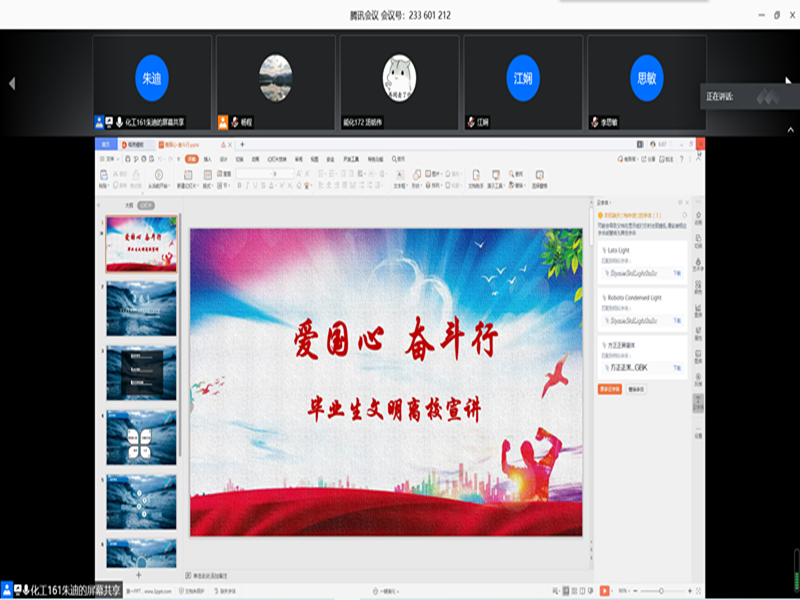 學(xué)院精心為每位畢業(yè)生制作畢業(yè)紀(jì)念優(yōu)盤,表達(dá)學(xué)院對畢業(yè)生的殷殷期盼,望石化學(xué)子奔涌前行;畢業(yè)學(xué)子創(chuàng)作畢業(yè)歌曲《化說再見》,記錄別樣青春時(shí)光;畢業(yè)典禮嚴(yán)肅活潑,讓畢業(yè)生擁有難忘且珍貴的記憶;考研宿舍感恩活動(dòng)傳遞正能量,難忘宿管阿姨、食堂阿姨的關(guān)懷照顧;畢業(yè)班會(huì)憶往昔話今朝,師生情深,不說再見;考研學(xué)霸班級(jí)勵(lì)志成長,激勵(lì)石化學(xué)子乘風(fēng)破浪;“青年講師團(tuán)”畢業(yè)文明離校宣講活動(dòng),傳遞愛國情,砥礪奮斗行;誠信教育線上活動(dòng),學(xué)生感恩資助,自立自強(qiáng);畢業(yè)班黨員學(xué)習(xí)經(jīng)驗(yàn)分享,不忘初心,揚(yáng)帆遠(yuǎn)航;考研經(jīng)驗(yàn)交流,站在學(xué)長學(xué)姐的肩膀,逐夢前行。