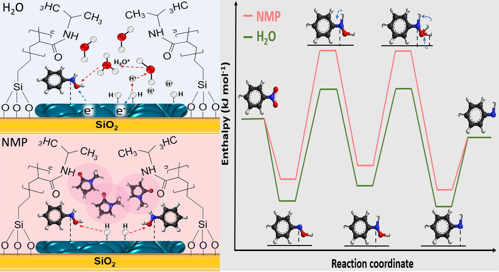 黃鵬程老師與荷蘭特文特大學(University of Twente) Leon Lefferts, Jimmy Faria Albanese 教授合作,進一步研究了液相加氫反應中使用聚合物修飾的催化劑對于亞硝酸鹽加氫反應的影響,聚合物在低于最低共溶溫度(LCST)(<32 ℃) 下與水分子形成氫鍵,從而使聚合物保持展開狀態(tài)。亞硝酸鹽加氫反應的詳細反應動力學研究表明,p-NIPAM 在低溫下將表觀活化能降低了3倍。 DOSY-NMR表征和分子動力學模擬計算表明,當存在 p-NIPAM時,限制了Pd/SiO2表面的水分子的流動性。聚合物的這種限制會擾亂水與金屬的相互作用,從而降低亞硝酸鹽質子-電子轉移還原的能壘。