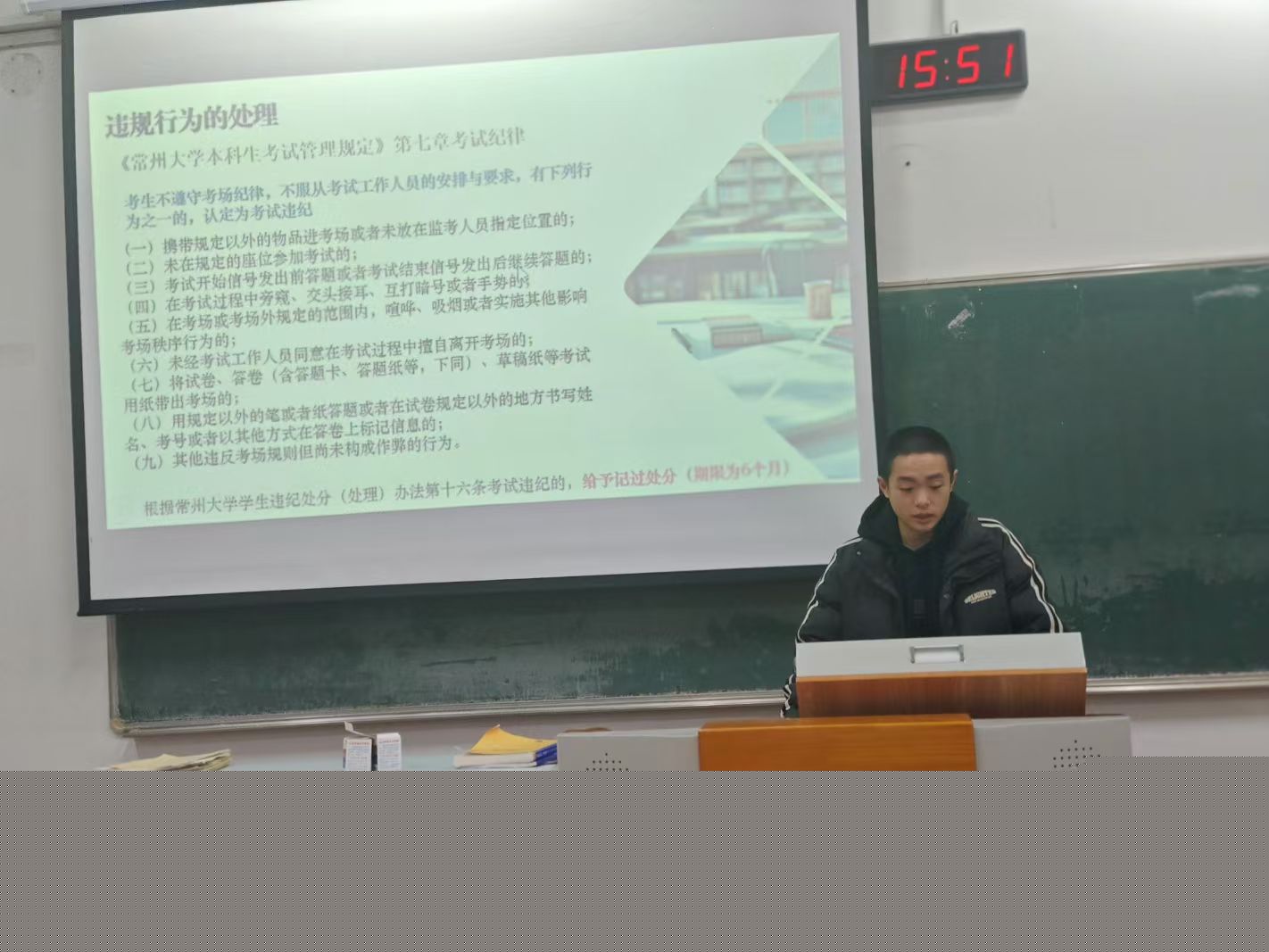 各班班會(huì)主講人帶領(lǐng)班級(jí)同學(xué)系統(tǒng)學(xué)習(xí)了《國(guó)家教育考試違規(guī)處理辦法》、《常州大學(xué)本科生考試管理規(guī)定》以及《常州大學(xué)學(xué)生違紀(jì)處分(處理)辦法》,并結(jié)合數(shù)起考試作弊案例闡述了誠(chéng)信的重要性,以及因誠(chéng)信缺失所帶來(lái)的嚴(yán)重后果,警示同學(xué)們?cè)诳荚囘^(guò)程中必須堅(jiān)守誠(chéng)信原則,要嚴(yán)格遵守各項(xiàng)規(guī)章制度。班會(huì)最后,各班班長(zhǎng)帶領(lǐng)班級(jí)同學(xué)簽下誠(chéng)信考試承諾書(shū),同學(xué)們莊重承諾,會(huì)以誠(chéng)實(shí)守信的態(tài)度對(duì)待每一場(chǎng)考試,展現(xiàn)出優(yōu)良的考風(fēng)考紀(jì)。