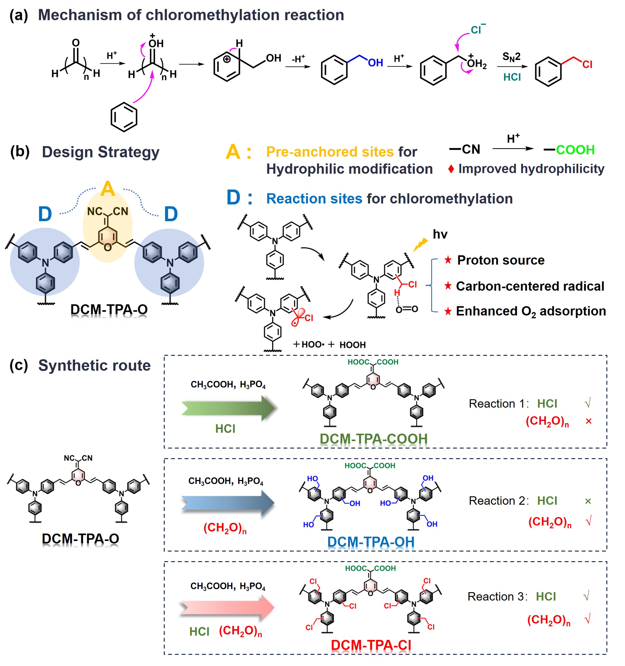 (1)針對氧氣吸附能力不足的問題,在CMPs材料中通過后修飾反應(yīng)引入吸電子基團(tuán)是解決此問題的好方法(圖1)。在之前的工作中引入磺酸基和季銨鹽(Adv. Funct. Mater.2025, 35, 2415244)的基礎(chǔ)上,我們首次將氯甲基引入CMPs中用于高效生產(chǎn)H2O2。在聚合物催化劑的制備中,氯甲基修飾的聚合物常用作傅-克烷基化等交聯(lián)反應(yīng)的中間體,因其疏水性而未在光催化產(chǎn)H2O2領(lǐng)域引起重視。經(jīng)典的Blanc氯甲基化反應(yīng)常用聚甲醛和鹽酸為氯甲基化試劑,磷酸或冰醋酸等為縮合劑?;诖?,我們在材料設(shè)計中以三苯胺為反應(yīng)位點,以氰根為酸化位點,通過一步氯甲基化反應(yīng),同時引入氯甲基和羧基,分別用于增強(qiáng)氧氣吸附和改善親水性。經(jīng)氯甲基修飾的CMPs在純水和空氣中的產(chǎn)H2O2速率達(dá)到5.0 mmol g-1 h-1,在氧氣氛圍中的性能僅增長1.8%,證明其氧氣吸附能力之強(qiáng)。而在苯甲醇和水的混合溶劑中性能更是達(dá)到了38.0 mmol g-1 h-1,超過大多數(shù)目前已報到的催化劑。該工作以Chloromethylation modified pyranonitrile-based conjugated microporous polymers for selective one-step two-electron O2 reduction to H2O2為題,發(fā)表在化學(xué)領(lǐng)域頂級期刊Angew. Chem. Int. Ed.2025, 64, e202508436。