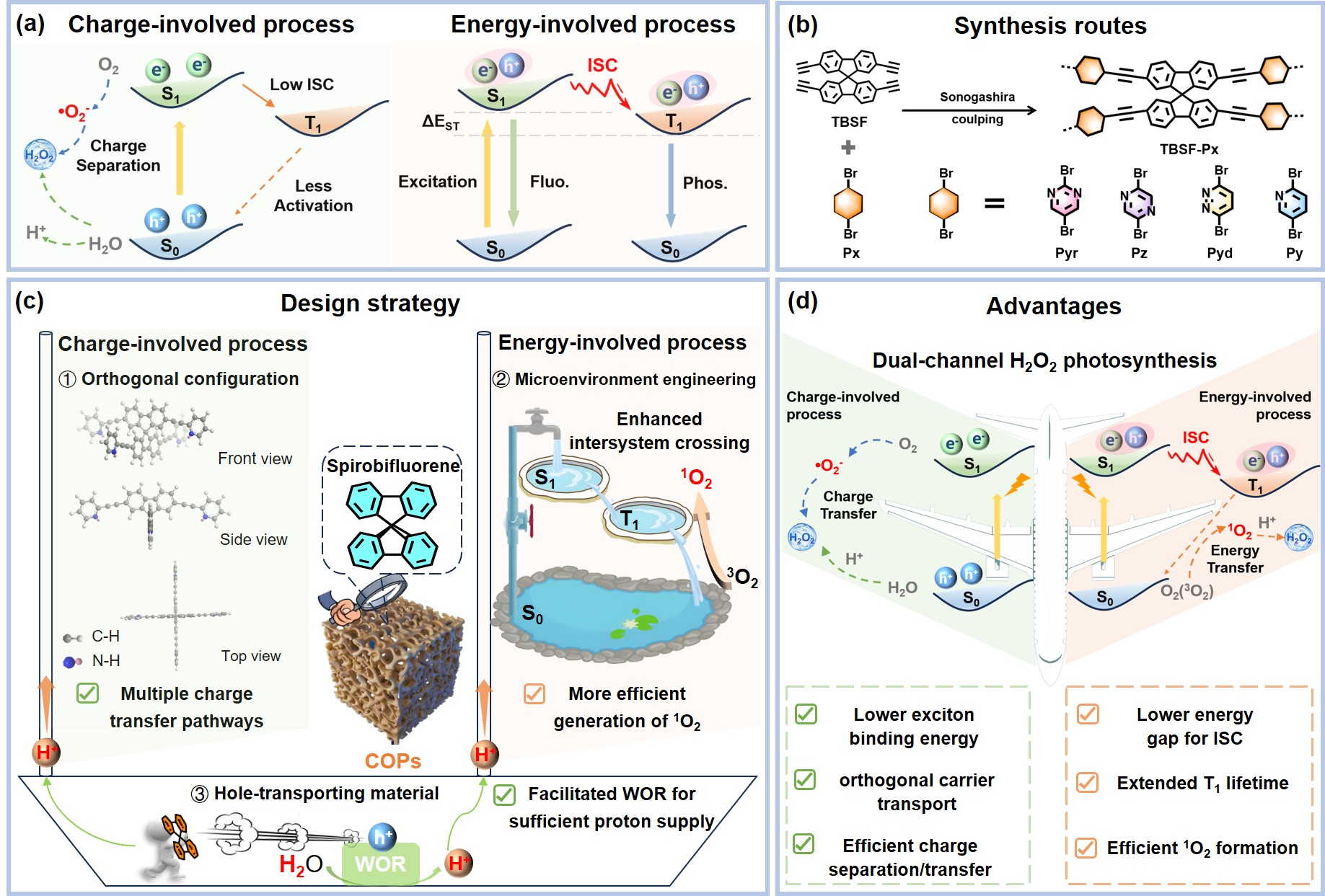 (3)針對能量路徑較弱的問題,我們探索了將傳統(tǒng)的電荷路徑與能量路徑耦合的策略。能量路徑是指以單線態(tài)氧(1O2)為關(guān)鍵中間體生產(chǎn)H2O2,1O2主要由三線態(tài)氧(3O2)產(chǎn)生,此過程涉及從三重激發(fā)態(tài)(T1)回到基態(tài)(S0)的能量轉(zhuǎn)移。目前大多數(shù)催化劑的T1壽命較短,難以穩(wěn)定存在,這是能量路徑研究較少的主要原因。為此,我們繼續(xù)以螺二芴為結(jié)構(gòu)單元,通過交聯(lián)劑的微環(huán)境調(diào)控制備一系列COPs催化劑,提高其電荷和能量雙路徑的性能(圖3)。其優(yōu)點包括:在電荷路徑,降低了激子結(jié)合能,提高電荷分離效率,通過正交通道增強(qiáng)電荷傳輸;在能量路徑,降低了從單重激發(fā)態(tài)(S1)到T1的能壘,加速系間竄躍,延長T1壽命,從而提高生產(chǎn)1O2的效率。優(yōu)化后的COPs催化劑在在純水和空氣中的產(chǎn)H2O2速率達(dá)到7.21 mmol g-1 h-1,太陽能-化學(xué)能轉(zhuǎn)化效率更是高達(dá)1.88%。該類催化劑在三相漂浮體系、太陽光照實驗、連續(xù)流實驗和滅菌實驗中均取得了較好的性能。該工作以Achieve a simultaneous charge- and energy-involved dual-channel mechanism in spirobifluorene-based conjugated organic polymers for enhanced H2O2 photosynthesis為題發(fā)表在化學(xué)領(lǐng)域頂級期刊J. Am. Chem. Soc.2025, DOI: 10.1021/jacs.5c16544.